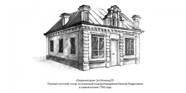 Вот что «Домовая летопись» сообщает об этом: «В сию ж зиму, к рождественской неделе, учрежден от генерала был в чертежной оперный дом где и чинили представления разных трагедий и комедий под смотрением и предводительством моим, причем на расходы со зрителей собиралось довольно денег и употреблялись на разные платья и уборы».