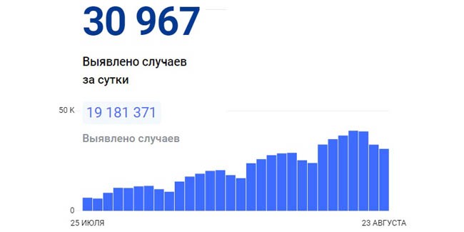 В России суточный прирост заразившихся коронавирусом составил 30 967 человек – это минимум за неделю. Всего COVID-19 диагностировали у 19,181 миллиона россиян, из которых 18,338 миллиона поправились и 383,7 тысячи скончались.