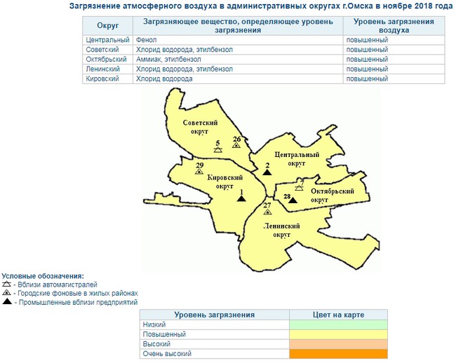 Уровень загрязнения воздуха в Омске был повышенным, как и в ноябре прошлого года. Выбросы фиксировались сравнительно редко: «Превышение предельно-допустимой концентрации загрязняющих веществ (ПДК), установленной Главным государственным санитарным врачом РФ, в атмосферном воздухе зарегистрировано по фенолу (1 случай из 571 пробы), хлориду водорода (5 случаев из 450 проб), аммиаку (1 случай из 450 проб), этилбензолу (11 случаев из 297 проб».