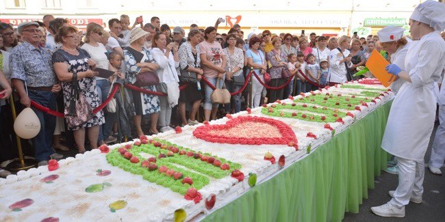 На глазах у гостей омские кондитеры испекли пирог длиной почти шесть метров, который омичи радостно съели до крошки.