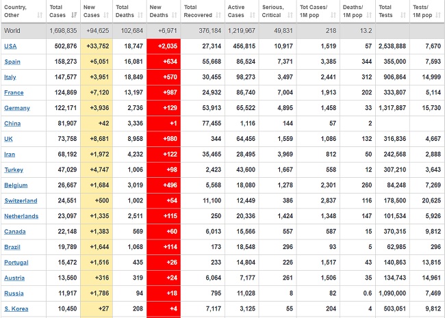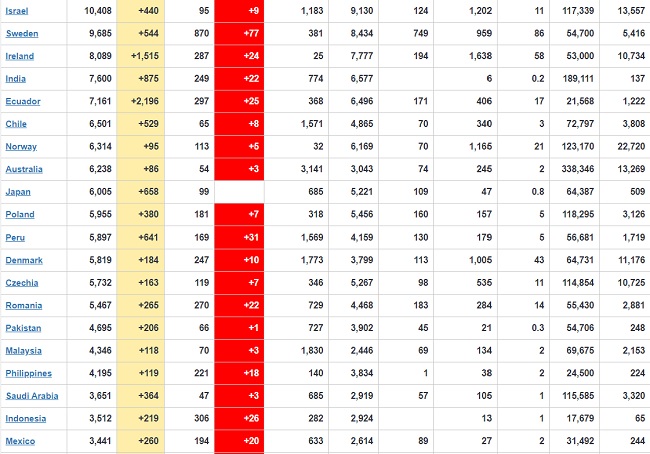 Данные по миру за сутки 10 апреля (с 00-00 по 24-00) по данным "Всемирной статистики" — одного из трех источников, которыми официально пользуется Роспотребнадзор (желтым — число заболевших за сутки, красным — число умерших за сутки):