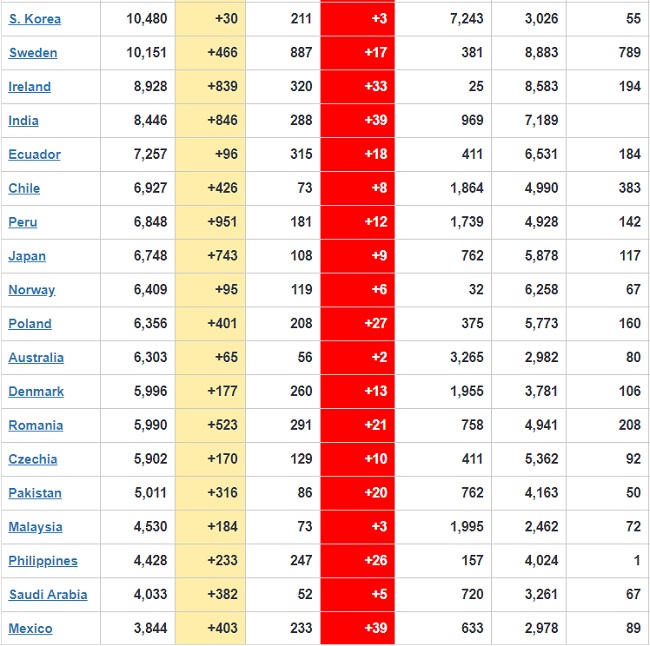 Данные по миру за сутки 11 апреля (с 00-00 по 24-00) по данным "Всемирной статистики" — одного из трех источников, которыми официально пользуется Роспотребнадзор (желтым — число заболевших за сутки, красным — число умерших за сутки, российские данные, судя по цифрам, — за сутки 10 апреля):