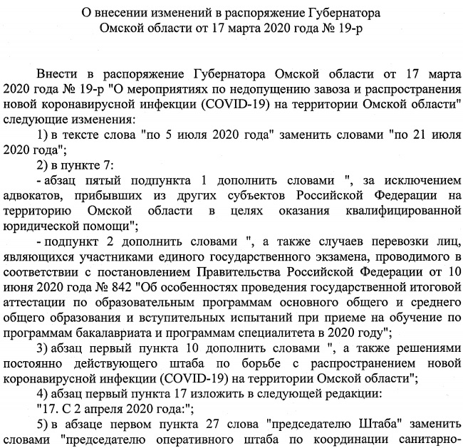 По итогам состоявшегося 3 июля заседания оперативного штаба Омской области по борьбе с коронавирусной инфекцией, губернатор Александр БУРКОВ подписал очередное изменение своего мартовского распоряжения о самоизоляции. Напомним, что ограничений для граждан, кроме ношения масок в общественных местах, практически уже нет, однако ряд организаций, открытие которых должно было состояться на третьем этапе снятия ограничений, так и не могут дождаться этого третьего этапа – его начало уже несколько раз переносили. На этот раз – до 21 июля. Впрочем, традиционно предоставляем читателям полный текст распоряжения губернатора о неснятии ограничений (предыдущую версию читайте здесь):