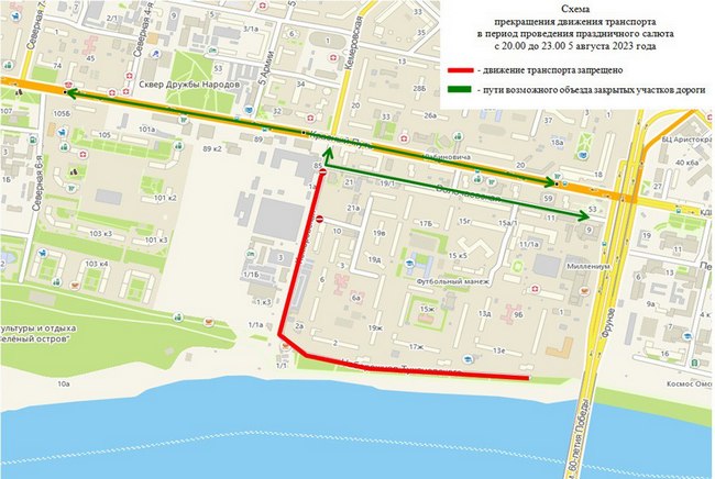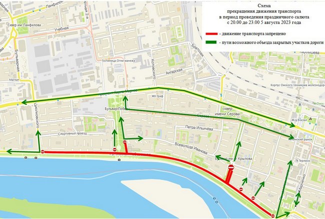 • С 20 часов до 23 часов 5 августа – улица Иртышская Набережная на участке от улицы Циолковского до улицы Рождественского, включая Бульвар Победы и улицу Ф. Крылова на участке от улицы В. Иванова до Иртышской набережной; улица Андрианова на участке от улицы Пригородная до улицы Братьев Сазоновых, улицу Пригородная; улица набережная Тухачевского на участке от улицы Кемеровская до моста имени 60-летия Победы, улица Кемеровская на участке от улицы набережная Тухачевского до улицы Волочаевской.