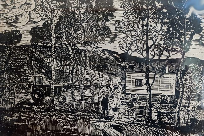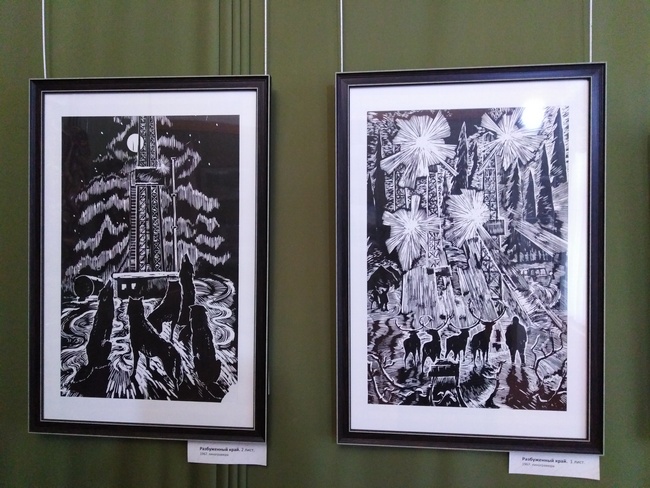 Есть несколько линогравюр. Особенно выразителен среди них диптих «Разбуженный край». В нем – романтика освоения севера, сочетающая эмоциональный подъем и тревогу, черты «сурового стиля», характерного для советского изобразительного искусства 1960-х. Любовь к линогравюре, конечно же, привил МОЛЧАНОВУ Анатолий Алексеевич ЧЕРМОШЕНЦЕВ. Он был его педагогом на худграфе, хотя они практически ровесники.