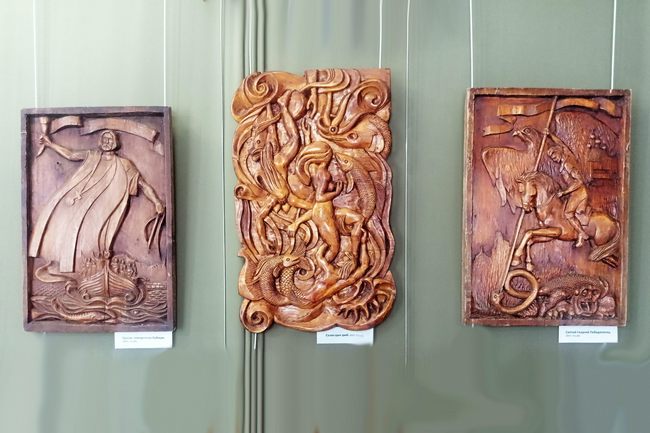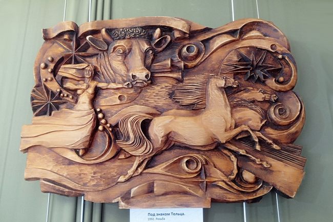 Также на выставке можно увидеть декоративно-прикладные работы в технике резьбы по дереву: «Ермак, покоритель Сибири», «Под знаком Тельца», «Святой Георгий Победоносец».