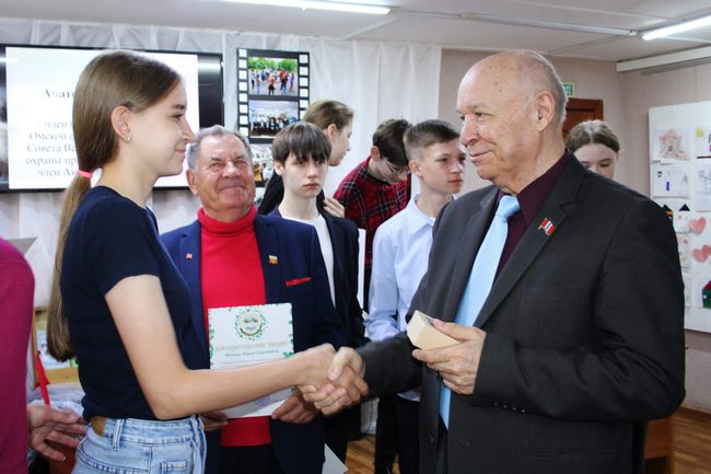 Благодарственными письмами Омского отделения Всероссийского общества охраны природы были награждены старшеклассники школ за активную совместную работу с ветеранскими организациями по охране природы. Награды получили Дарья ГОЛОВАНЬ, Александра АЛЕШКОВА, Захар КУКАРЦЕВ, Кирилл МЕРКУШЕВ, Ульяна МАРИНЮК, Маргарита ЯКУНИНА, Максим ИСТОМИН, Семён ШИРОКИХ, Тимофей МИНКЕВИЧ. Награды вручала амбассадор Всероссийского общества охраны природы Лила Владиславовна ПОРОЛЛО.