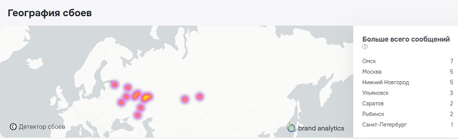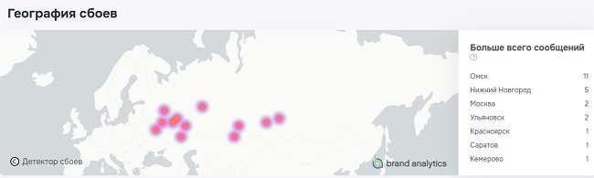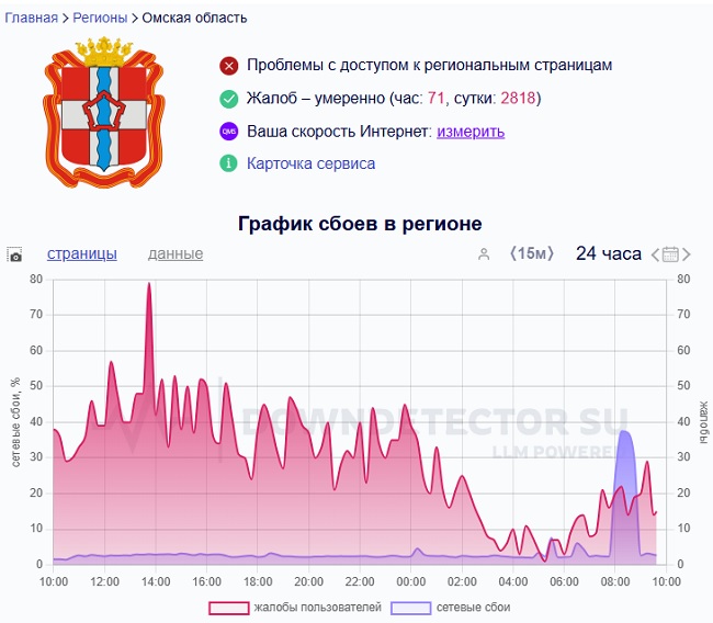Другой сервис детектора сбоев downdetector.brandanalytics, с похожим названием, но независимый от предыдущего, показал по данным на 10 часов утра по омскому времени, что жалоб на медленный интернет из Омска больше, чем из любого другого региона России.