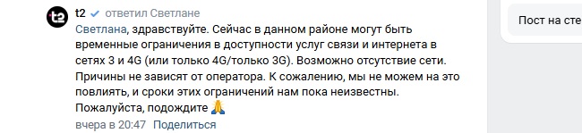 Вчера, оператор Т2, отвечая омичке в паблике «Инцидент Омск», буквально опроверг губернатора: