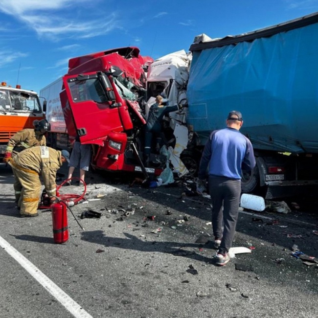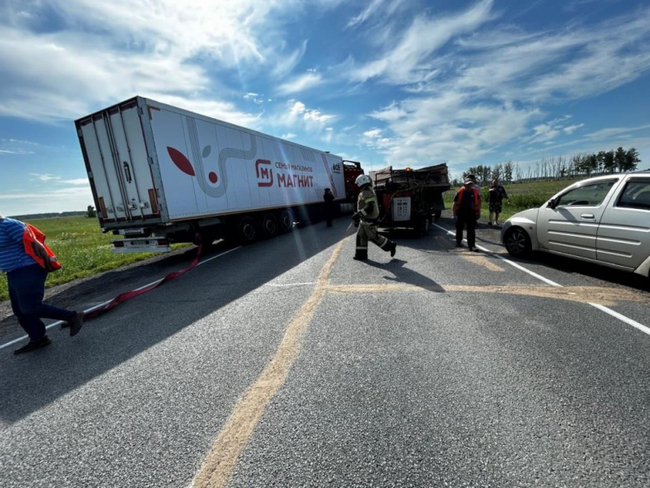 Следственно-оперативная группа полиции ОМВД по Крутинскому району 9 июля осмотрела место ДТП (на фото) в районе 432-го километра трассы Тюмень – Омск. Полицейскими предварительно установлено: 43-летний водитель большегрузного автомобиля Sitrak (житель Нижегородской области) при объезде участка, на котором проводятся дорожные работы, выехал на полосу встречного движения и врезался в большегруз Scania под управлением 36-летнего жителя Алтайского края.