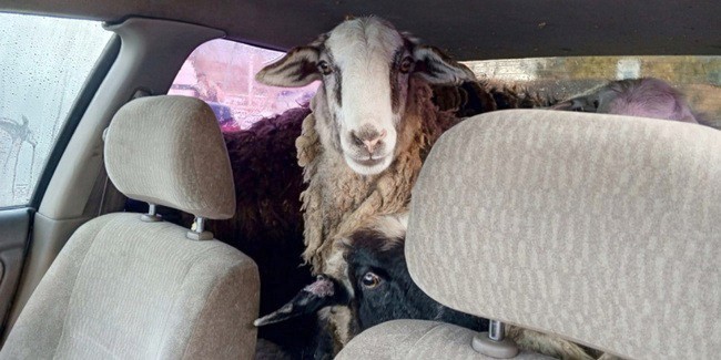 Автомобиль Nissan Sunny был остановлен бдительными дорожными полицейскими – и водитель не смог пояснить, откуда в салоне и багажнике машины находятся восемь баранов (на фото).