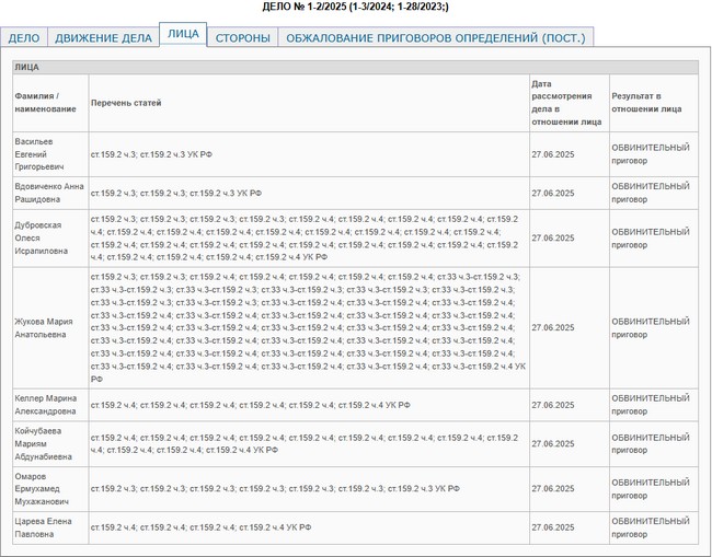 Судья Называевского горсуда Наталья СТРУЧИНСКАЯ признала виновными замдиректора кредитного потребительского кооператива (КПК) «Содействие» Марию ЖУКОВУ и семерых риелторов в мошенничествах при получении выплат (чч.3–4 ст.159.2 УК РФ). Организатору назначено 3,5 года лишения свободы в колонии общего режима, одной из соучастников – 3 года лишения свободы с отсрочкой до достижения ребёнком 14-летнего возраста. Остальным членам группы определено наказание в виде лишения свободы условно на срок от 1 года 7 месяцев до 2,5 года. Также суд обязал их в полном объёме возместить причинённый ущерб. Адвокат одной осуждённой уже подал апелляционную жалобу на приговор. Прокуратура должна предоставить свои возражения до 25 июля, после чего все материалы направят в облсуд, следует из карточки дела №1-2/2025 (1-3/2024; 1-28/2023).