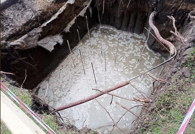 На дне ямы торчат прутки арматуры. Для безопасности отдыхающих яму огородили досками.