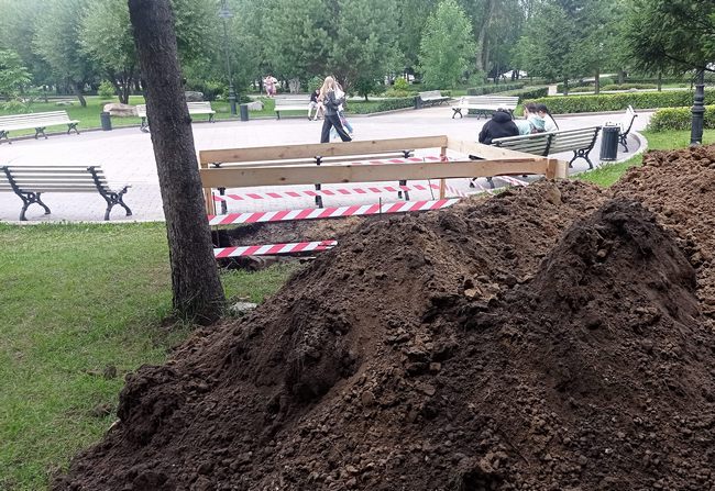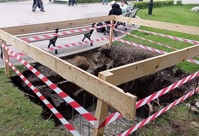 После совещания автор данных строк посетил сквер. Там действительно в примерно в 50 метрах от фонтана была выкопана яма размерами 3×3 метра. Вот снимки.
