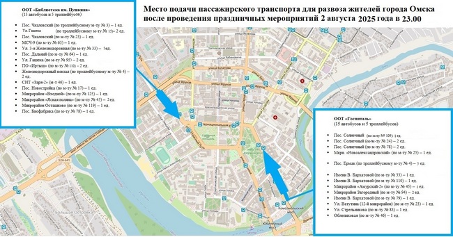 Пресс-служба мэрии заявила: для развоза гостей и участников мероприятий, посвящённых празднованию Дня Омска и Дня Омской области, 2 августа на остановки «Библиотека им. Пушкина» и «Госпиталь» будут поданы дополнительные 30 автобусов и 10 троллейбусов. Транспорт поедет по самым востребованным маршрутам.