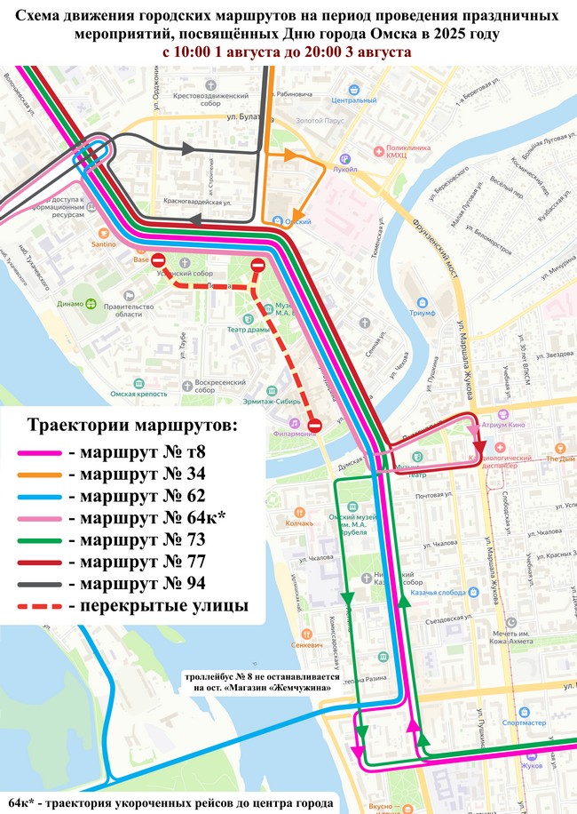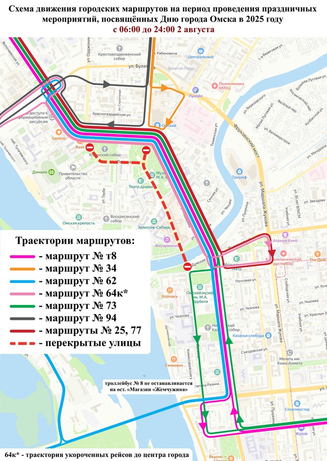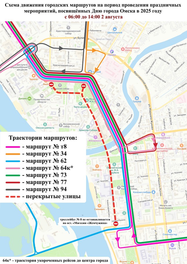 Для проведения 70 праздничных мероприятий, посвящённых Дню города и Дню Омской области, на центральных улицах вводятся ограничения для движения всех видов транспорта.