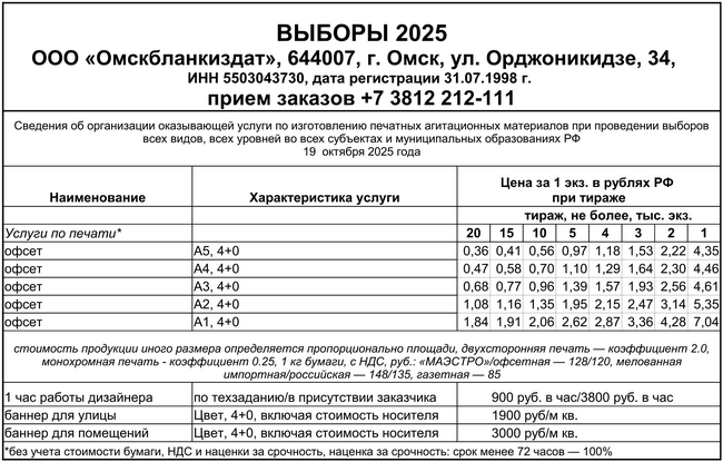 Стоимость услуг по изготовлению и размещению агитационных материалов при проведении выборов, назначенных на 19 октября