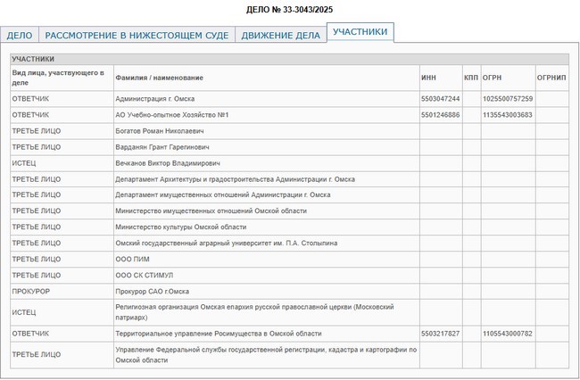 Омский облсуд (на фото) рассмотрел апелляционное дело №33-3043/2025 по жалобам на решение Советского райсуда о принадлежности здания Храма Покрова Пресвятой Богородицы. Истцами по гражданскому делу №2-4452/2022, которое рассматривалось в суде первой инстанции с 15 ноября 2022 года, являлись Омская епархия русской православной церкви (Московский патриарх) и Виктор ВЕЧКАНОВ, ответчиками – Администрация Омска, АО «Учебно-опытное хозяйство №1» и Территориальное управление Росимущества в Омской области.