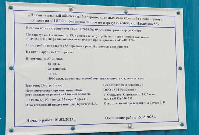 Как пояснила пресс-секретарь Губернатора и Правительства Омской области Мина АХВЕРДИЕВА, на информационном щите: «с 1.02.2025 по 15.03.2025 — это сроки работ по расчистке территории под возведение конструкции. Сдача объекта в эксплуатацию по графику до конца этого года. Все работы ведутся по плану и без отставаний».