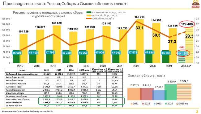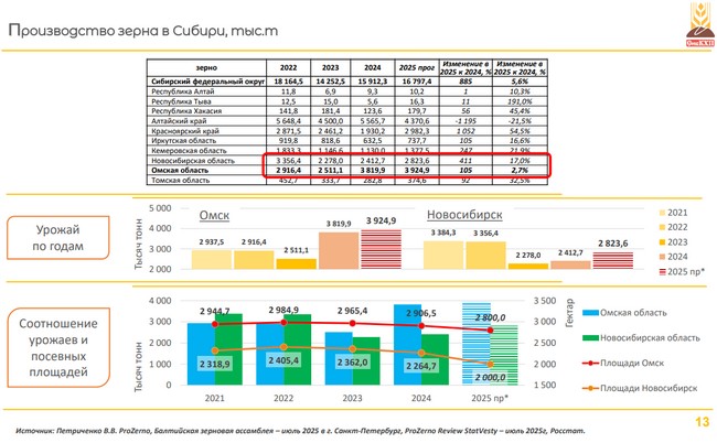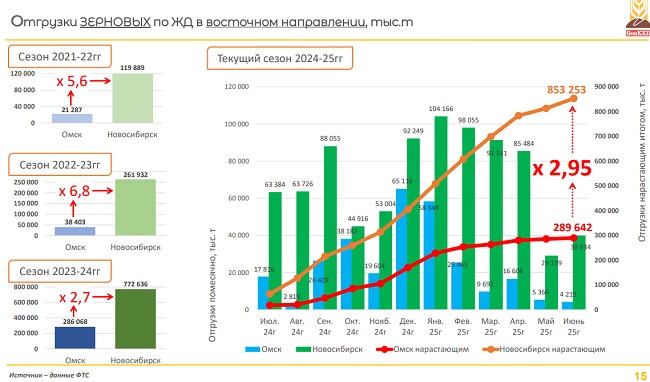 — Урожай зерна в Новосибирской области в 2024 году составил 2,4 млн тонн. В Омской области – 3,8 млн тонн. У нас сопоставимое количество гектаров. Переход в масличные идет и там и там. Но каким-то чудом из Новосибирской области отгружается больше зерна! 2,3 млн тонн в прошлом году отгружено по железной дороге. Каждый год из Новосибирской области отправляется больше зерна, чем из Омска. Я надеюсь, что это колоссальный потенциал Омской области, который в будущем нам помогут раскрыть, либо есть какие-то нюансы о перетоках зерна, о которых мы пока не знаем.