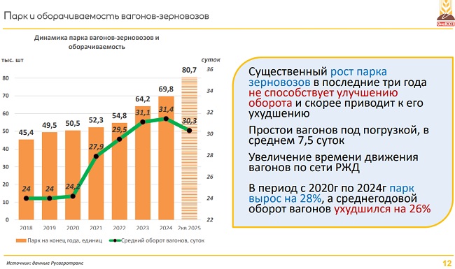Спикер напомнил о значительной удаленности Омска от портов Новороссийска и Владивостока и обратил внимание на то, что рост парка вагонов-зерновозов приводит к ухудшению оборота. С 2020 по 2024 год парк вырос на 28%, а среднегодовой оборот вагонов ухудшился на 26%.