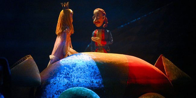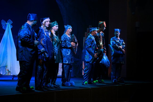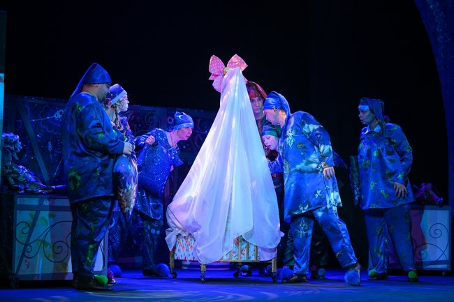 Антон НЕСТЕРЕНКО предлагает сейчас нечто вроде сказки-колыбельной для детей от пяти лет. Спектакль начинается с того, что Сказочник (Дмитрий ВОЙДАК) и его помощники пытаются усыпить Принцессу, а также обещают зрителям: «Мы сейчас вам расскажем такую историю, что вы все уснете». Но, как говорится, уснешь тут!