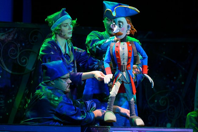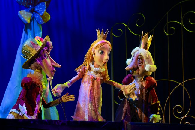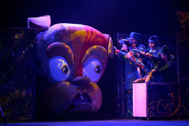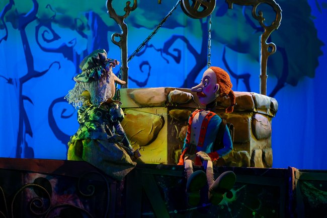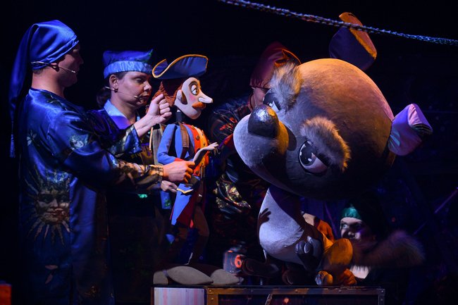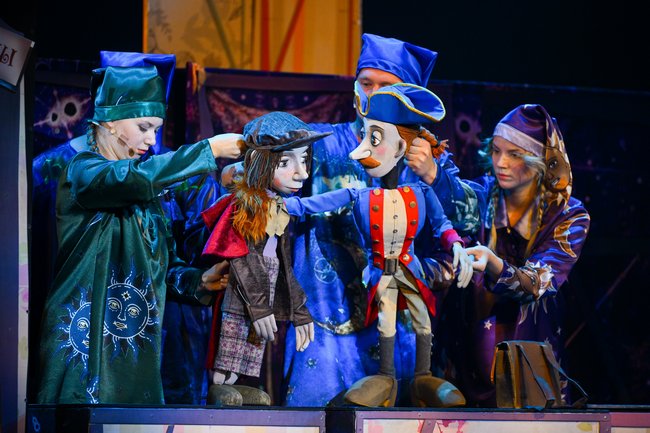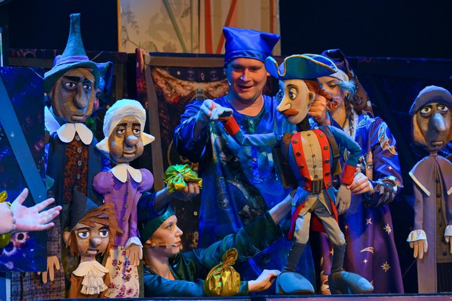 В спектакле задействованы самые разные куклы: тростевые, планшетные, много здесь и живого плана. На некоторых героев приходится по несколько кукол, что позволяет молниеносно перебрасывать действие из одного места в другое, таким образом создавая динамику. Актеры легко подхватывают кукол и роли друг у друга. Вообще, всегда удивляешься, насколько актеры театра кукол независимы от амплуа.