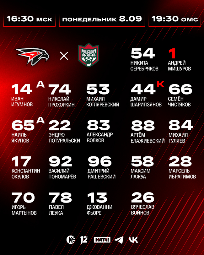 Омский «Авангард» начал сезон регулярного чемпионата КХЛ 8 сентября на домашней на «G-Drive Арене» матчем с казанским «Ак Барсом» при аншлаге – 12 011 зрителей. Однако «ястребы» играли сумбурно, менее остро и проиграли «барсам» со счётом 1:2 (0:1, 0:1, 1:0).