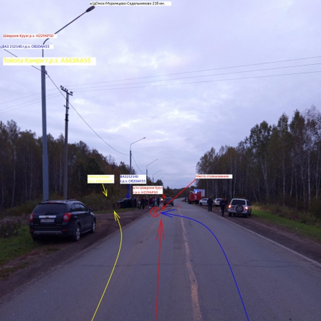 Следственно-оперативная группа полиции вечером 11 сентября осмотрела место дорожно-транспортного происшествия (на фото) в районе 218-го километра трассы Омск – Муромцево – Седельниково. Полицейскими предварительно установлено: 42-летний водитель Chevrolet Cruze около 19:25 выехал на полосу встречного движения и врезался в попутный автомобиль ВАЗ-212140, который поворачивал налево.
