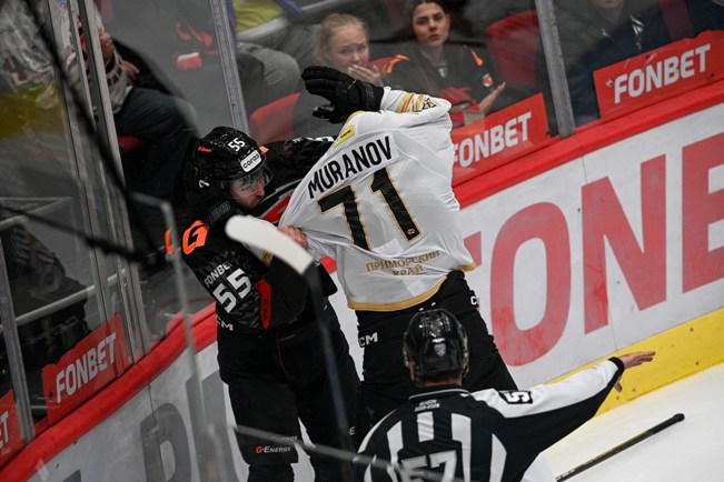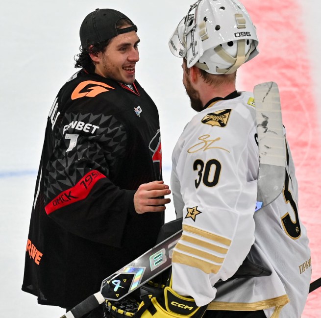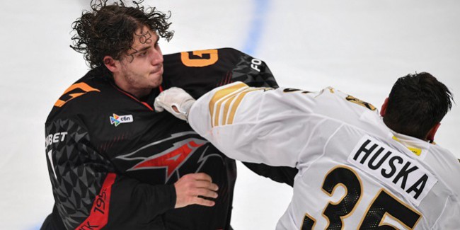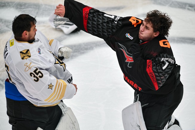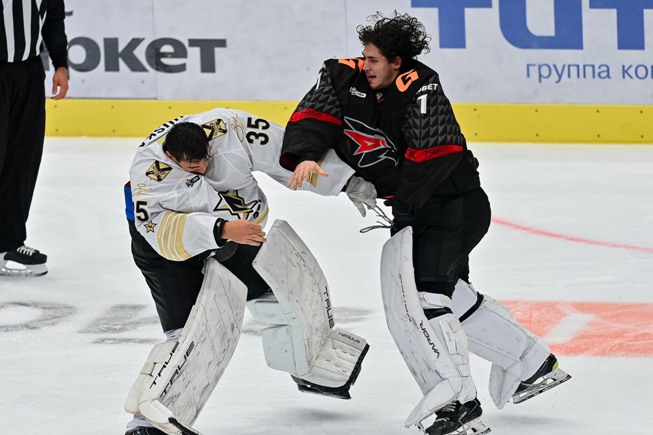 В красивом кулачном бою голкиперы соорудили много ударов – и по одному очень точному и чувствительному. Как и на каком языке Андрей МИШУРОВ и Адам ХУСКА, игравшие в прошлом сезоне за «Адмирал», сумели тут договориться о драке, так и осталось загадкой.
