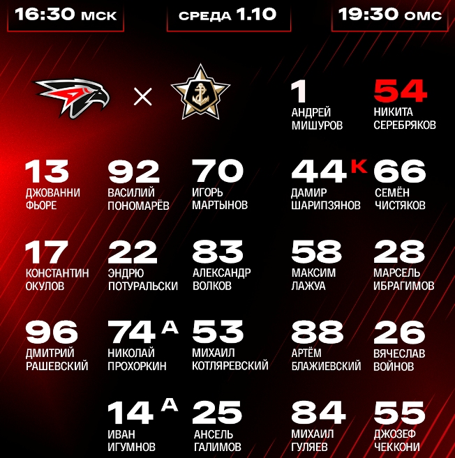 Хорошо проведя четырёхматчевую выездную серию (набрали 6 очков) омские «ястребы» вернулись в Омск. На домашней «G-Drive Арене» 1 октября хоккеисты «Авангарда» (14 очков и 3-е место на «Востоке») разгромил владивостокский «Адмирал» (8 очков, 9-е место) со счётом 6:1 (4:1, 2:0, 0:0).