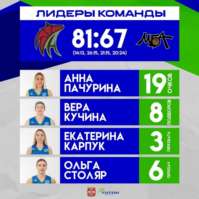 «В третьей десятиминутке благодаря серии точных трёхочковых от Анны ПАЧУРИНОЙ преимущество хозяек достигло 20 очков, и казалось, судьба матча предопределена. Но капитан МБА-МГУСиТ Мария КОРШАКОВА придерживалась диаметрально противоположной точки зрения. В первые три минуты четвёртой четверти ей удалось реализовать 5 (!) трёхочковых подряд, практически отыграв всё отставание своей команды. Вернуться в игру омским «волчицам» помогли своевременные тайм-ауты Элен ШАКИРОВОЙ. И хотя былого отрыва «Нефтянику-Титану» добиться уже не удалось, итоговые «+14» могут давать болельщикам повод для оптимизма перед ответным матчем, который пройдёт 29 октября», – отметили в пресс-службе омского клуба.
