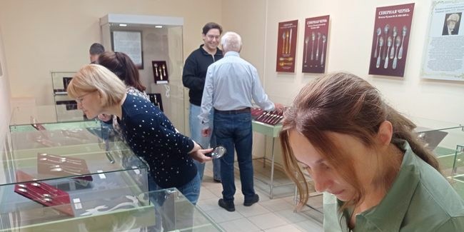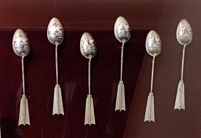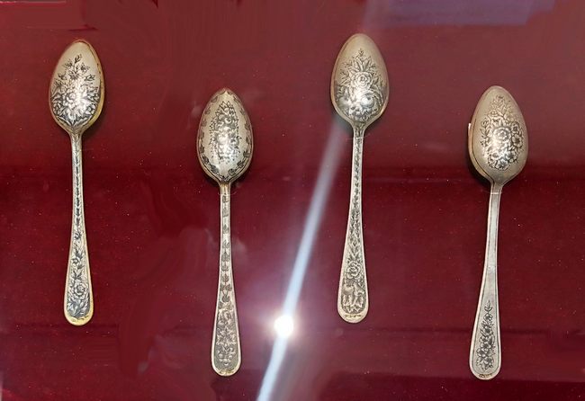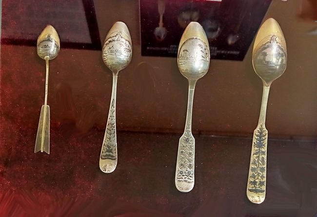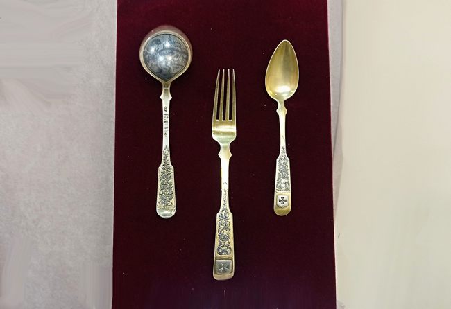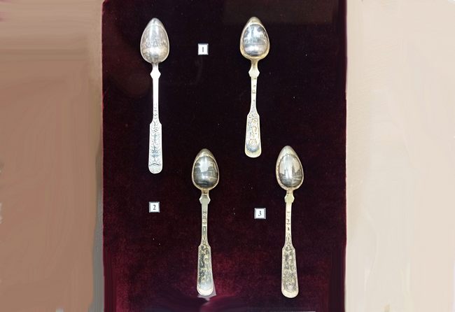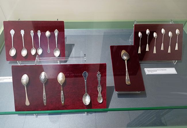На первом стенде – пять его ложек, на втором – вилка, нож и ложка. Шесть ложек хранятся в Вологодском музее заповеднике.