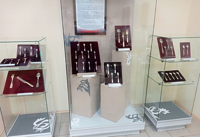 Стенд с серебряными изделиями, сделанными мастерами в Великом Устюге в 1960–1990 годы. На изделия нанесены геометрические узоры.