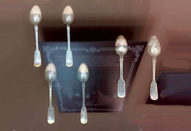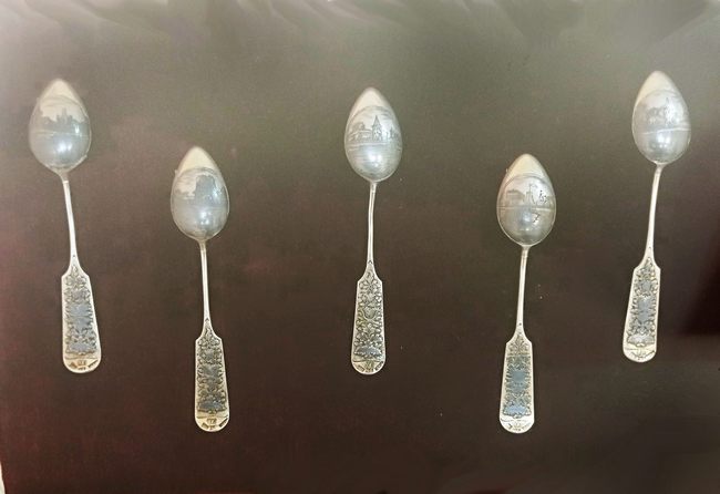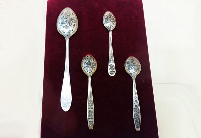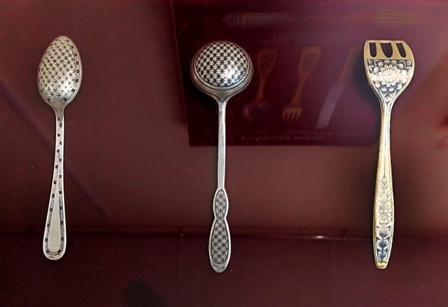 Представлены серебряные ложки с чернью мастера Ильи Минаева (Вологда, 1840) и мастера Ивана Зуева (Вологда, 1843).