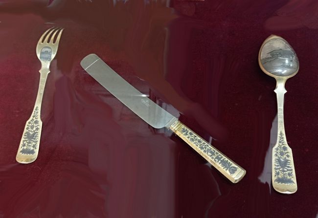 Сакердон Скрипицын – выдающийся вологодский мастер нанесения черни на серебряные изделия. В 1839 году участвовал в выставке в Санкт-Петербурге. На данной выставке представлены его две ложки и вилка.