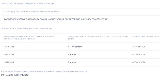 На торги поступило три заявки, и все три участника снизили стоимость работ до одной и той же суммы, совпадающей до копейки.