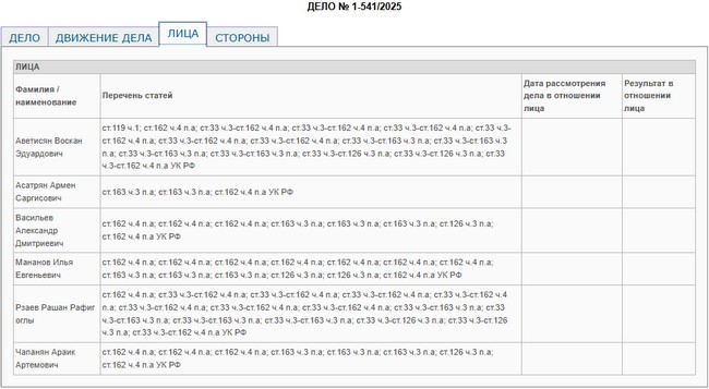 Судья Омского облсуда Артём ТОЛСТЫХ принял к производству уголовное дело (переданное по подсудности из Кировского райсуда №1-541/2025) в отношении шести жителей Омска, возрастом от 21 до 27 лет. Воскана АВЕТИСЯНА, Рашана РЗАЕВА, Армена АСАТРЯНА, Араика ЧАПАНЯНА, Илью МАНАНОВА и Александра ВАСИЛЬЕВА обвиняют, в зависимости от роли каждого, в 16 преступлениях: разбоях (п.«а» ч.4 ст.162 УК РФ), вымогательствах (п.«а» ч.3 ст.163 УК РФ) и похищении человека, (п.«а» ч.3 ст.126 УК РФ). Подсудимых защищают семь адвокатов. Сегодня, 7 ноября, состоялось первое заседание, где прокурор огласил обвинительное заключение и предложил порядок исследования доказательств, следует из карточки дела №2-23/2025.