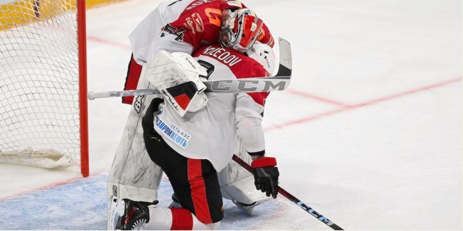 На экваторе третьего периода хозяева льда сравняли счёт: отличились с разницей в 4 минуты Андрей БЕЛОЗЁРОВ и Никита ХОРУЖЕВ (большинство). А за 2 секунды до конца основного времени настырный Андрей БЕЛОЗЁРОВ с помощью случайного рикошета от клюшки омича — в полёт шайбы парашютом, и детской ошибки Никиты СЕРЕБРЯКОВА — поймавшего ловушкой воздух, оформил дубль и установил окончательный счёт – 6:5.
