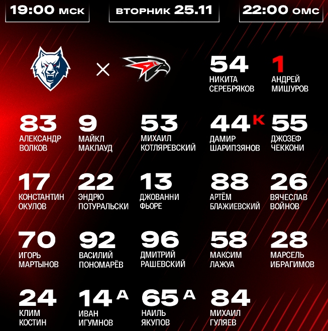 Обыграв «барсов» омские «ястребы» заняли второе место в рейтинге «Индекса силы» и вылетели в Нижнекамск. 25 ноября хоккеисты «Нефтехимика» (31 матч, 31 очко, 5-е место на «Востоке») в третьем периоде всё-таки догнали и обыграли «Авангард» (28 игр, 39 очков, 3-е место) со счётом 6:5 (1:3, 2:2, 3:0).