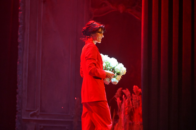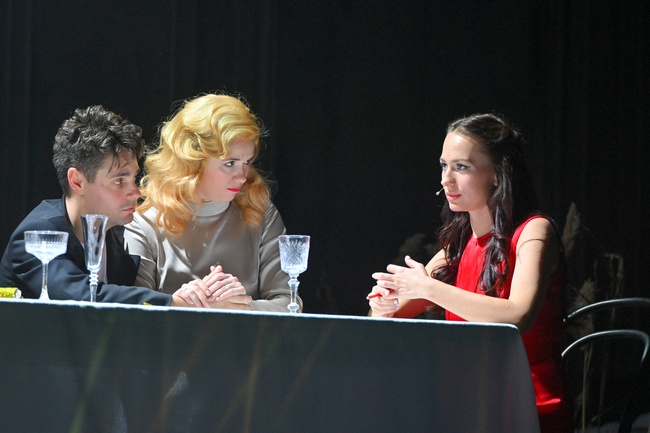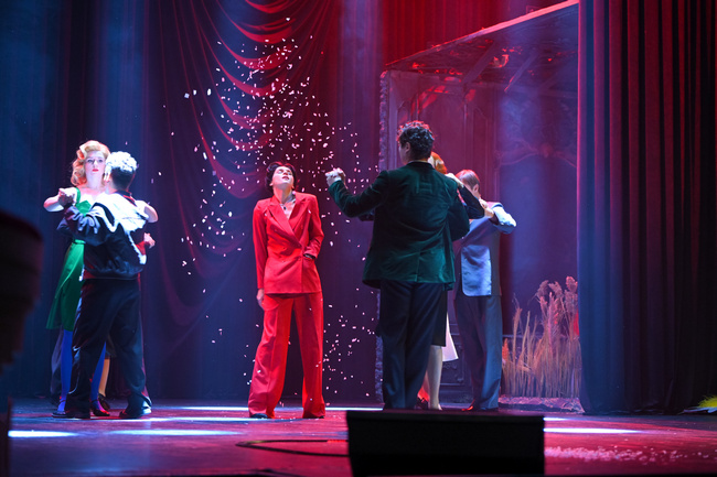 Возможно, постановщику это и неважно. У ЗАКУСОВОЙ получается какая-то обобщенная и вневременная история. В ней больше современных деталей, например, рассказ Долли о семье в жанре стендап или сцены в клубах вместо балов, но есть и отголоски иных эпох и вообще чего-то запредельного. Особенно это ощущается в музыке, специально написанной Кириллом ТАУШКИНЫМ, и в образе Певца-конферансье (Иван КУРАМОВ), олицетворяющего здесь некий фатум. В начале спектакля он выносит игрушечный паровозик и запускает его по закольцованным рельсам, посыпая дорогу снегом. Несмотря на сверкающий эстрадный костюм, он вдруг напоминает мистического мужичка с бородой из сна Анны, который предсказал скорую трагедию.