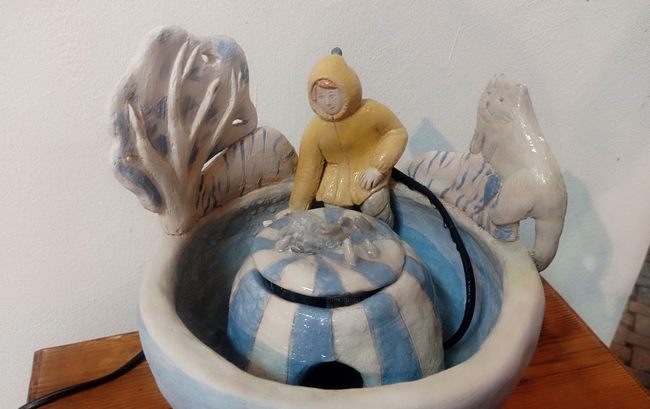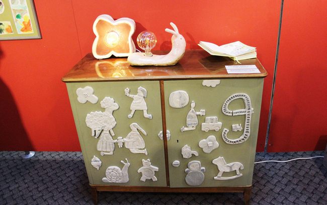 Вызывает восторг работа Алисы ПЛЯСУНОВОЙ, которая декорировала тумбочку фигурками из полуфарфора и сделала к ней еще лампу-цветок и лампу-гусеницу. Полуфарфор – материал сложный и хрупкий даже для взрослого керамиста. Алисе сейчас десять лет, в студию «Север» она пришла, когда ей было четыре. Годы занятий не прошли даром.