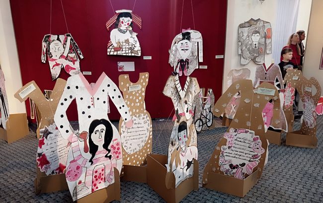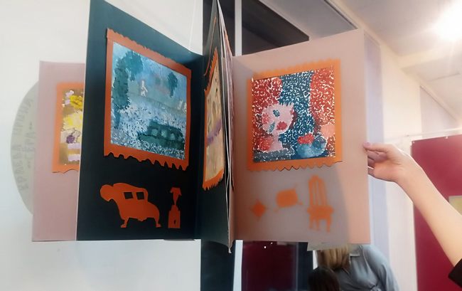 Очень теплый, семейный проект «Бабушкин сундук». В нем юные авторы рассказали о своих бабушках, которые сегодня пекут самые лучшие в мире пирожки и вяжут уютные свитера, а когда-то мечтали, например, о балете. Истории записаны и проиллюстрированы на картонных объектах в виде платьев и собраны в яркую, красочную инсталляцию.