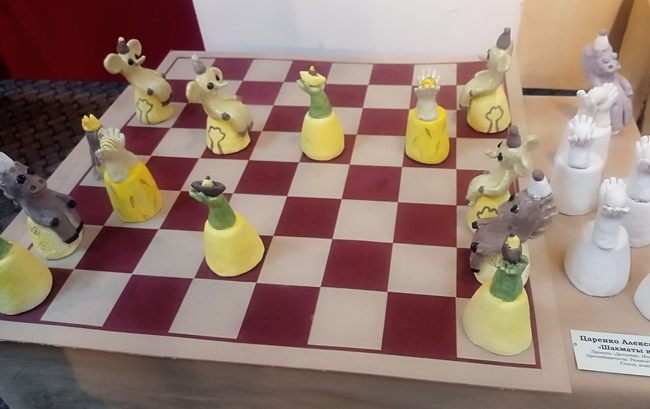На столах – комплекты шахмат. У Александра ЦАРЕНКО фигуры буквально соответствуют их названиям: конь – это конь, слон – это слон. А вот шахматы Маргариты КРАСИЛЬНИКОВОЙ выполнены в виде пирожных, которые можно «съесть», выиграв ход.
