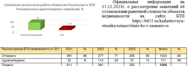Вывод: Таким образом, сравнивая работу Комиссии Росреестра и деятельность БТИ, можно сделать вывод о почти полной блокировке сотрудниками БТИ досудебного порядка установления кадастровой стоимости в размере рыночной по ст. 22.1 ФЗ 237.
