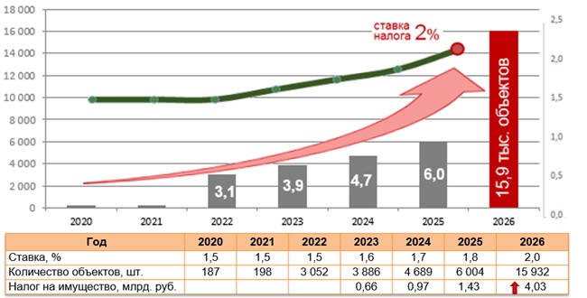 В 2024г. в сравнении с 2023г. ставка налога на имущество выросла с 1,6% до 1,7%, т.е. на 6%, а количество объектов с 3 886 до 4 689 шт. т.е. на 21%, что привело к увеличению собираемого налога на имущество на 32% до 973 млн. руб. И, если в 2026 году ставка налога увеличится до 2% (т.е. + 11% к 2025г.), а количество объектов вырастет с 6 тыс. шт., до 15,9 тыс. шт. (т.е. +266%), то по аналогии объем налога на имущество в 2026г. по сравнению с 2025г. должен вырасти в 3 раза?