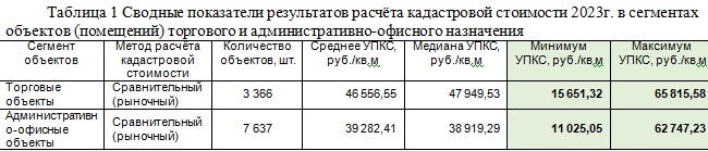 Для помещений,предусматривающих размещение офисов, торговых объектов, объектов общественного питания и бытового обслуживания (по ст. 378.2 НК РФ), получены следующие результаты кадастровой оценки, основанные на рыночных данных: