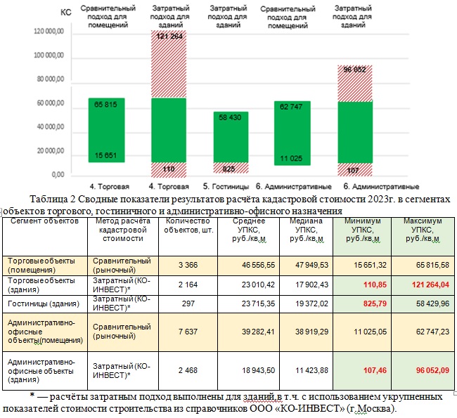 Для расчёта кадастровой стоимости объектов предусматривающихразмещение офисов, торговых объектов, объектов общественного питания и бытового обслуживания (по ст. 378.2 НК РФ) применены методы сравнительного подхода для помещений и затратного подхода для зданий.