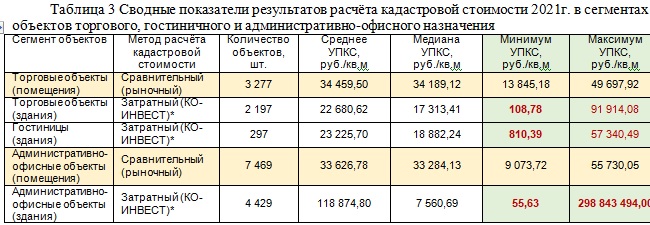 На 01.01.2021 г. для торговых объектов: среднерыночное – 43 801 руб./кв.м, для административно-офисных объектов: среднерыночное – 33 030 руб./кв.м, минимальное – 4 313 руб./кв.м., максимальное – 100 000 руб./кв.м.