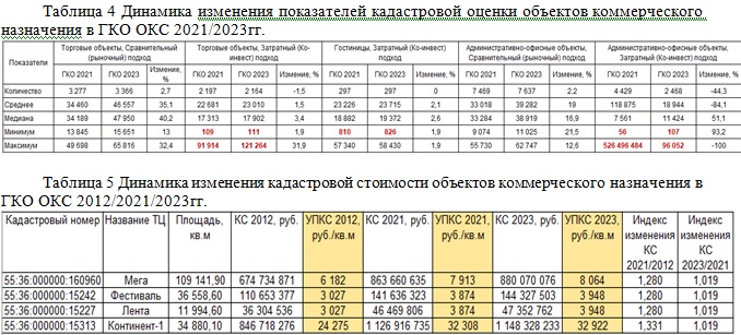 Проведен динамический анализ результатов государственной кадастровой оценки объектов капитального строительства в 2012/2021/2023 гг. (Отчёт № 03-ГКОН-55-2012 от 01.10.2012 г., Отчет № 03/окс/2021 от 20.07.2021 г., Отчет № 05/ОКС/2023 от 10.07.2023 г.).